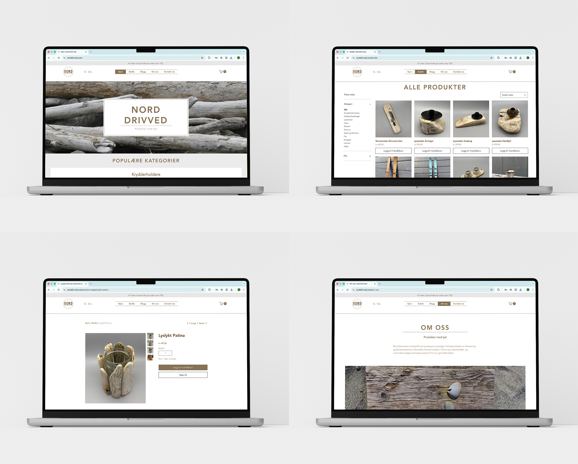 Som en del av universet rundt Nord Drivved har vi en nettbutikk som ble lansert i 2022. Nettsiden er designet av meg og er basert på vår grafiske profil. Den oppdateres jevnlig, og som en grafisk designer behandler jeg den som min levende portefølje. Allikevel passer jeg på å ha bedriften som hovedfokus, og for alle design-valg har jeg målgruppen i bakhodet.