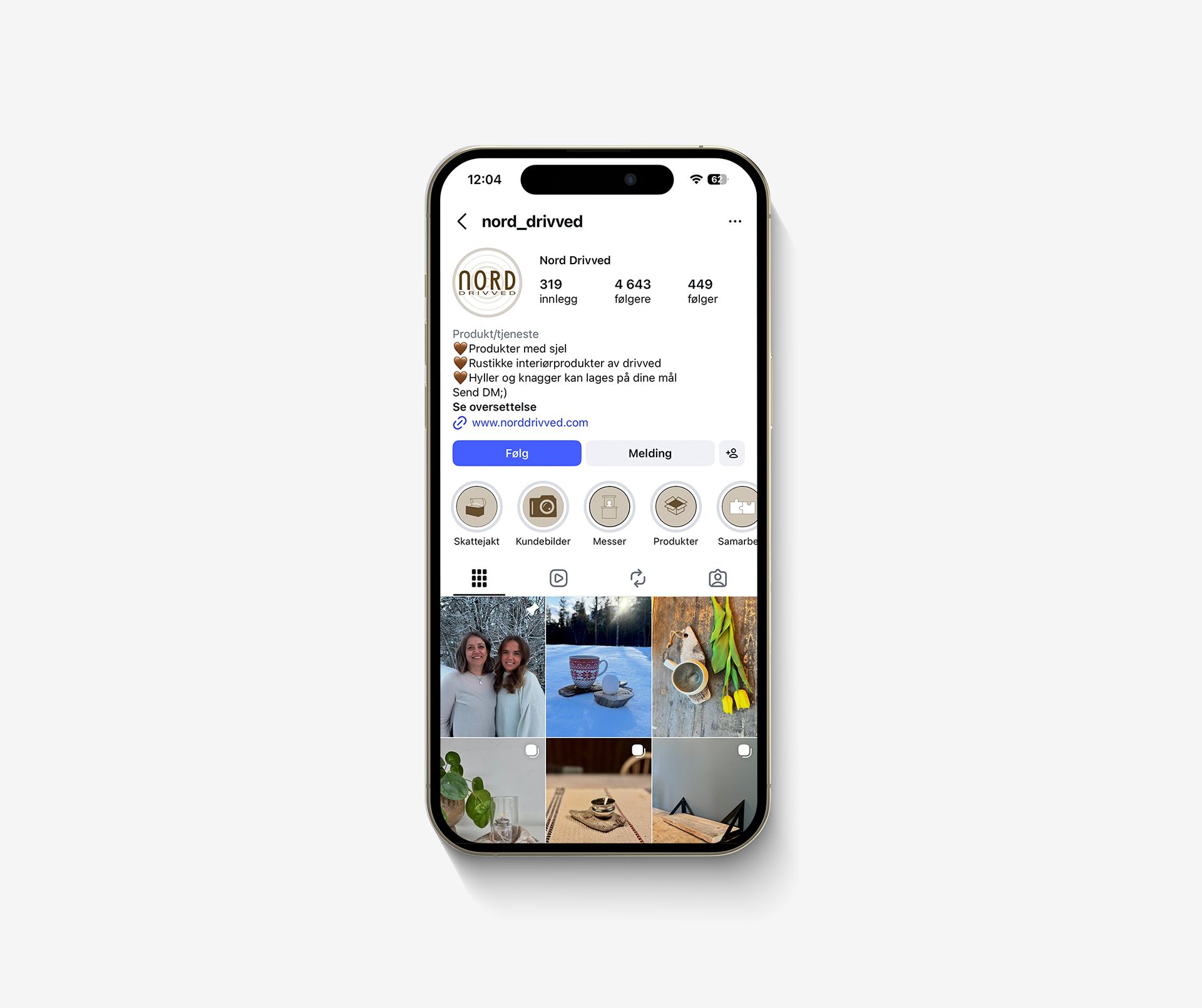 Som bedriftens grafiske designer har jeg designet bedriftens visuelle identitet. Jeg har også designet og publisert en nettbutikk hvor kundene kan kjøpe produktene våre. Min oppgave er å opprettholde denne nettsiden. Samtidig har jeg ansvaret for Instagram-kontoen vår (nord_drivved). Der poster vi ukentlig til våre 4000 følgere.